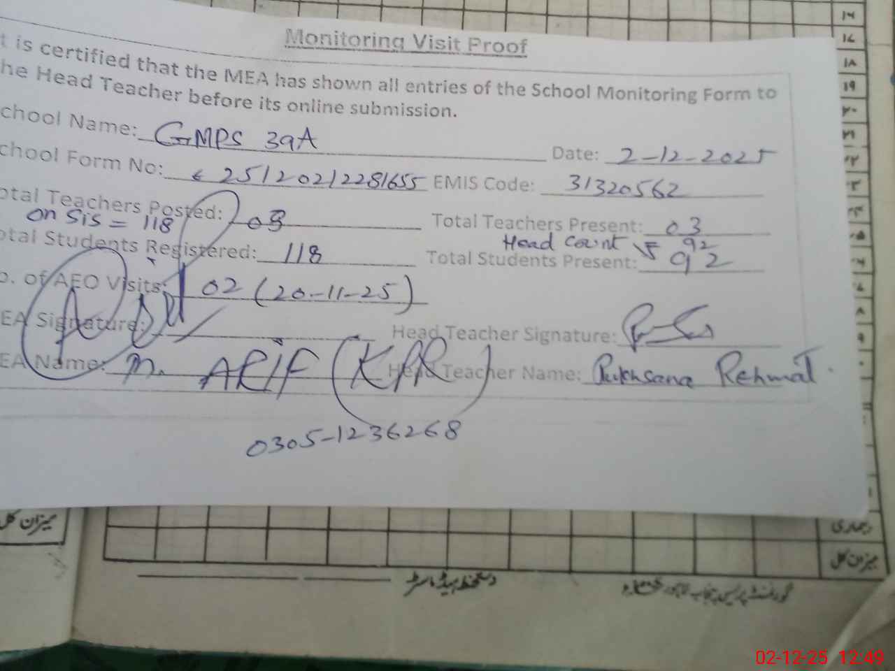 | Attendance Register | Head Teacher | MEA with School | Visit Proof |