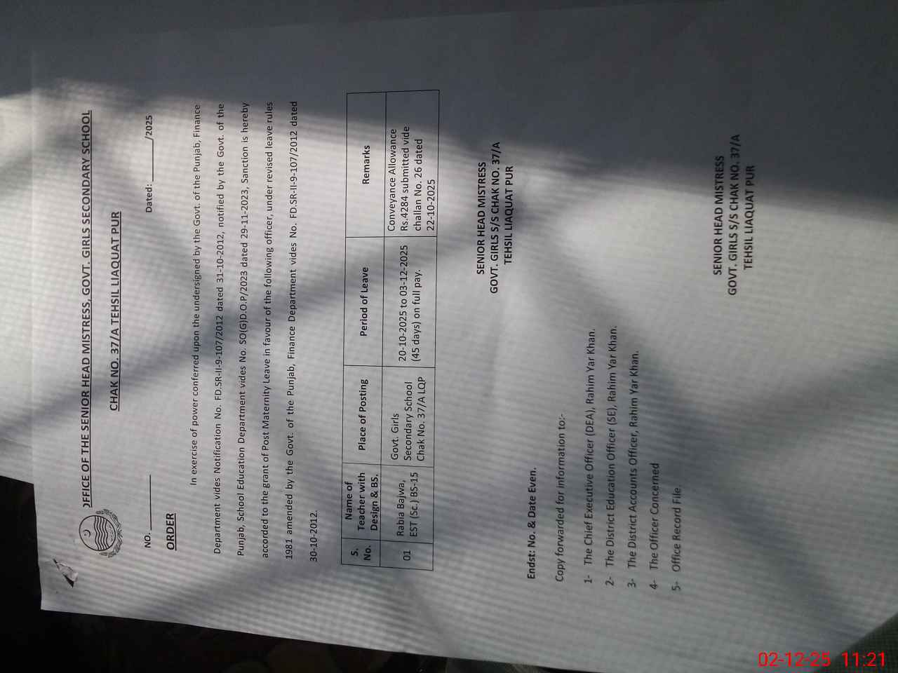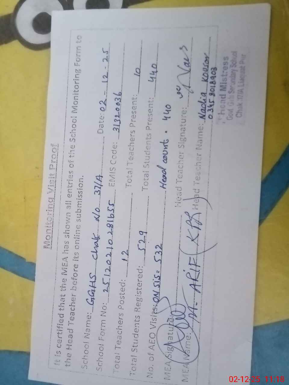 | EMIS Code: 31320036 | Name of School: GGHS CHAK NO. 37/A | |||