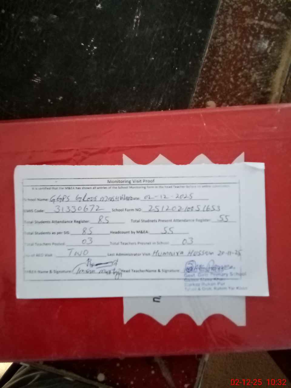 | Attendance Register | Head Teacher | MEA with School | Visit Proof |