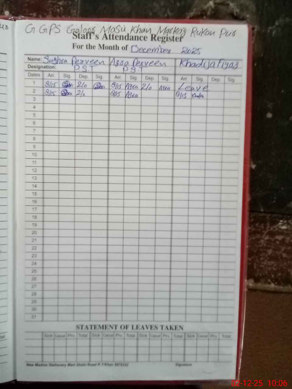 | Leave | Duty | Absent | Maternity | Medical | Ex- Pak |