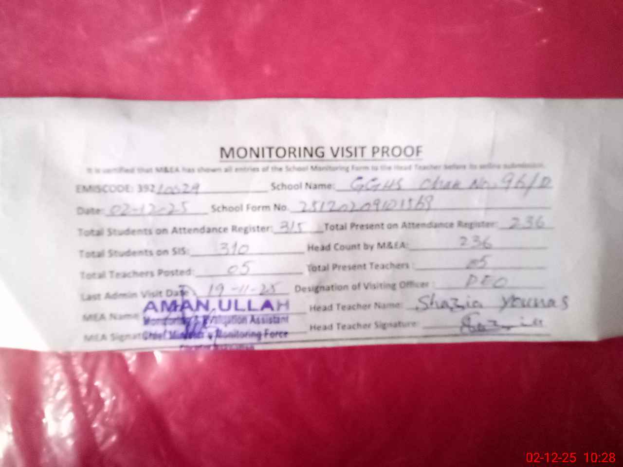 | Attendance Register | Head Teacher | MEA with School | Visit Proof |