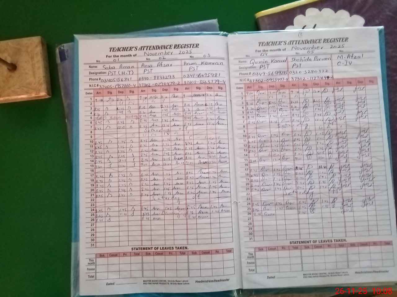 | CNIC | Full Name | Designation | R/C | Absence During Last Calender Month |