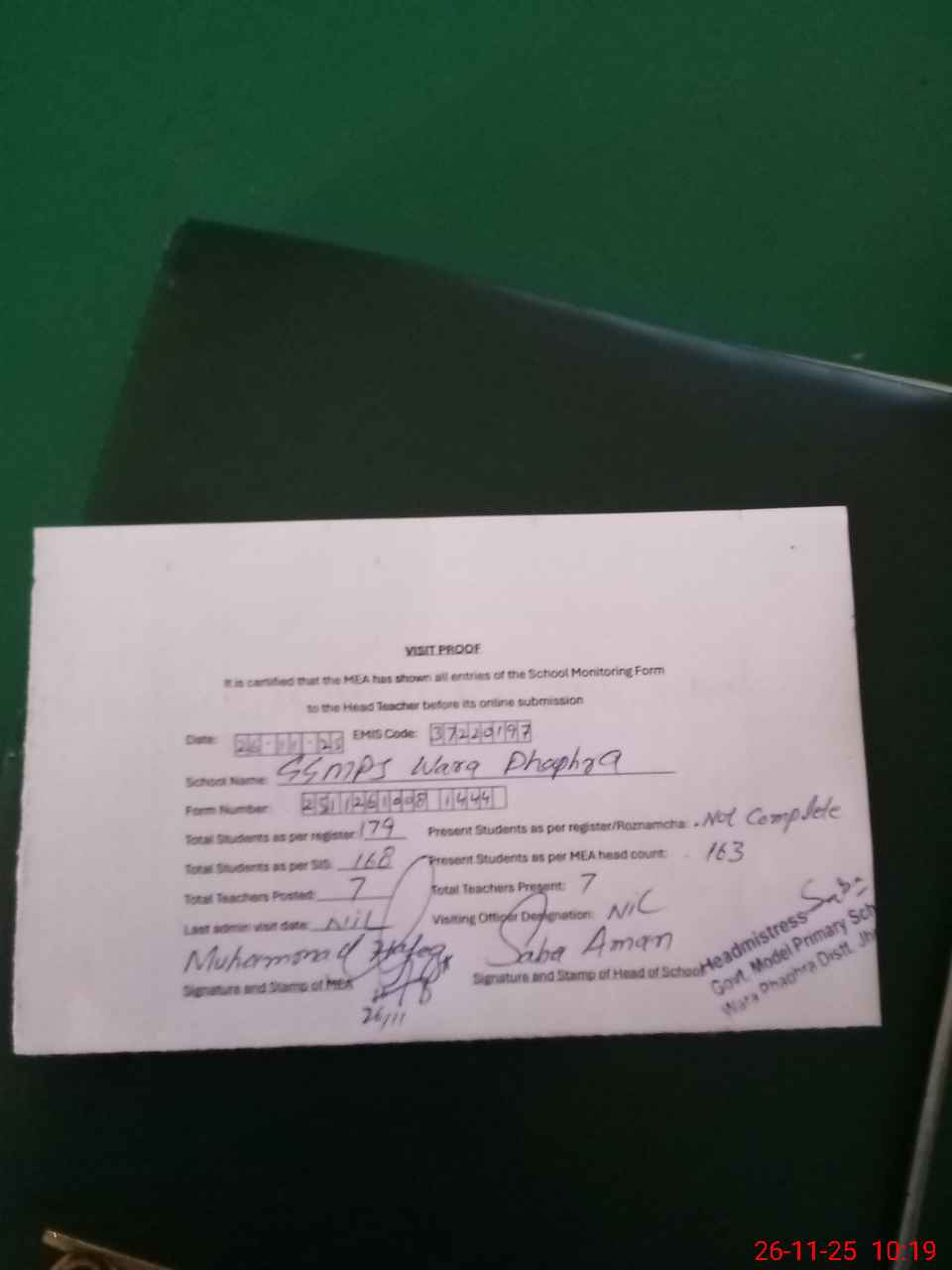 | Total no. of Classrooms: 5 No. of Classrooms Used for Teaching: 3 No. of Classrooms Storing Old Furniture, FTBs, etc: 0Comments if Any: Sir I reached on schedule visit 0920 hrs GMPS Wara Phaphra 37220197 Students attendance roznamacha not complete picture are available Fake students sitting in classes no mention anywhere about him. I check three class three students are sitting witho |