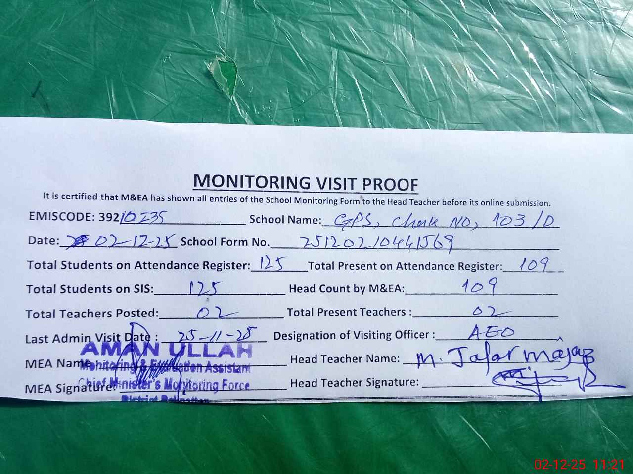 | EMIS Code: 39210235 | Name of School: GPS CHAK NO. 103 D | |||
