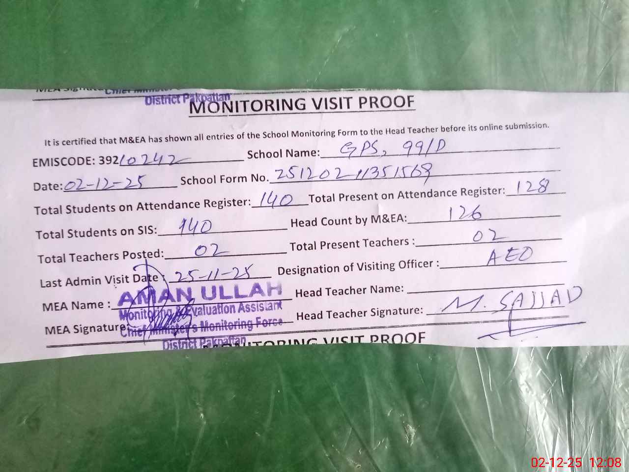 | EMIS Code: 39210242 | Name of School: GPS CHAK NO. 99 D | |||