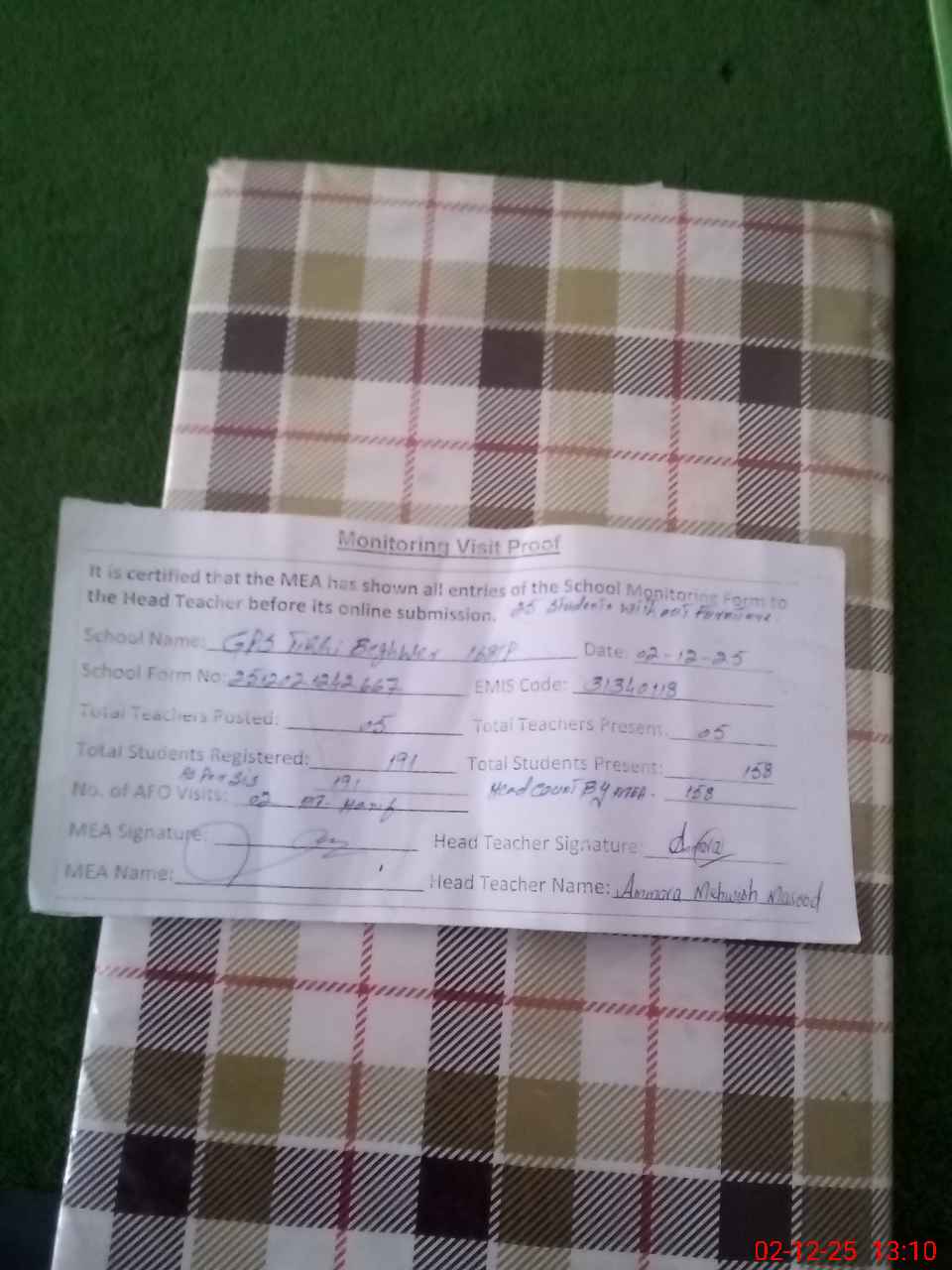 | Attendance Register | Head Teacher | MEA with School | Visit Proof |
