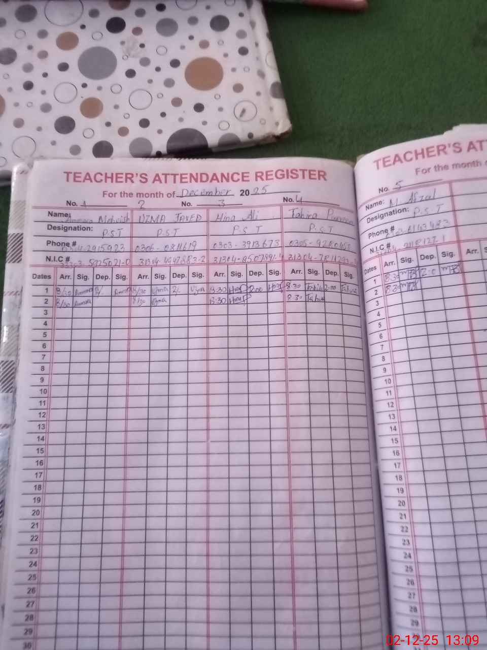 | CNIC | Full Name | Designation | R/C | Absence During Last Calender Month |