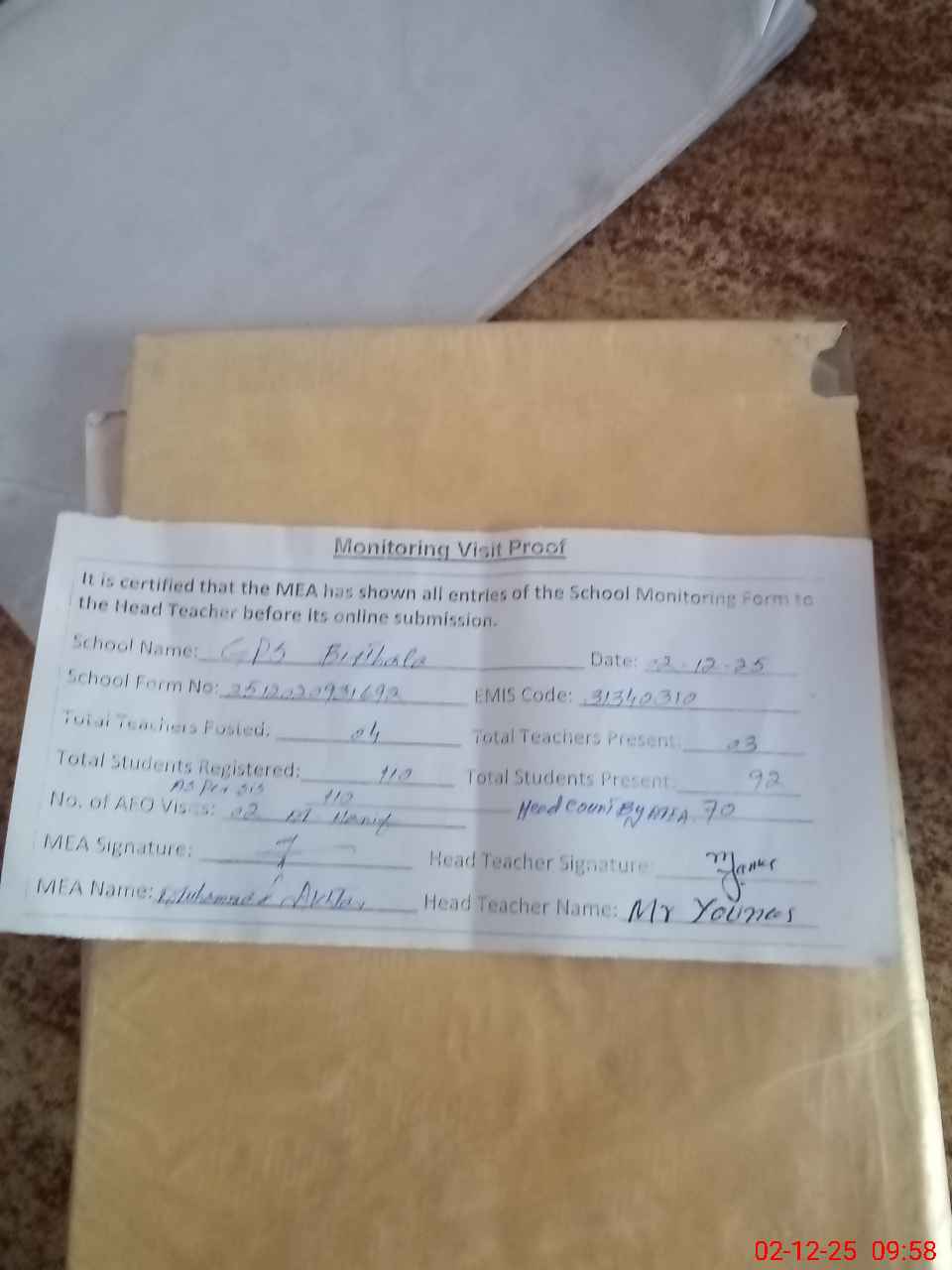 | Attendance Register | Head Teacher | MEA with School | Visit Proof |