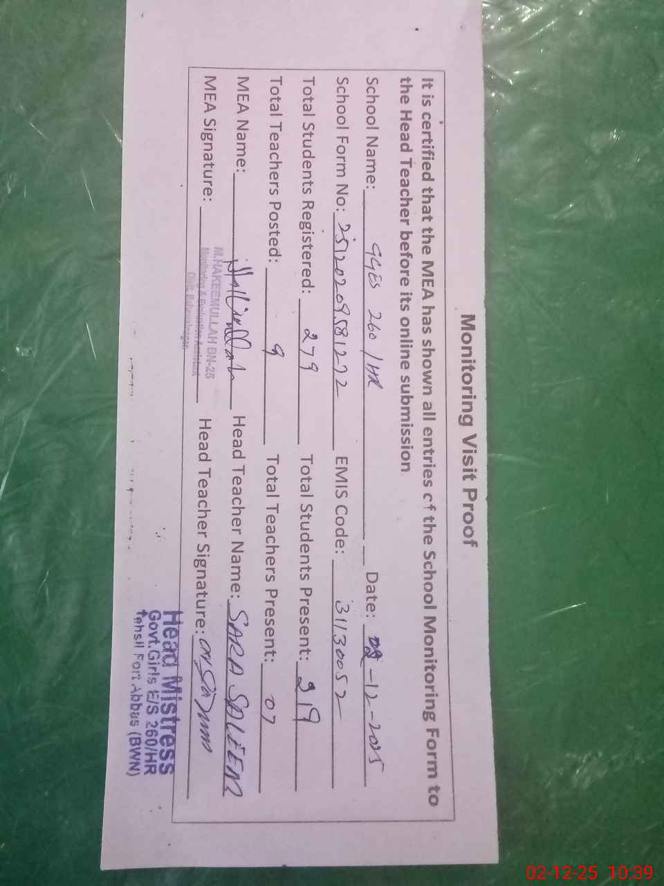 | Certified that this School was Inspected by the Undersigned MEA/DMO Today and the Information Stated Above is as Per Record. | |||||