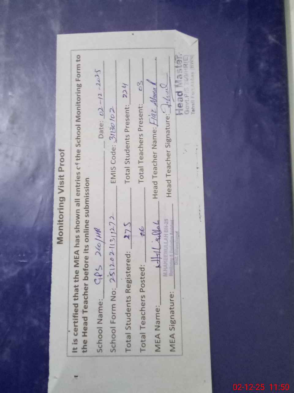 | Attendance Register | Head Teacher | MEA with School | Visit Proof |