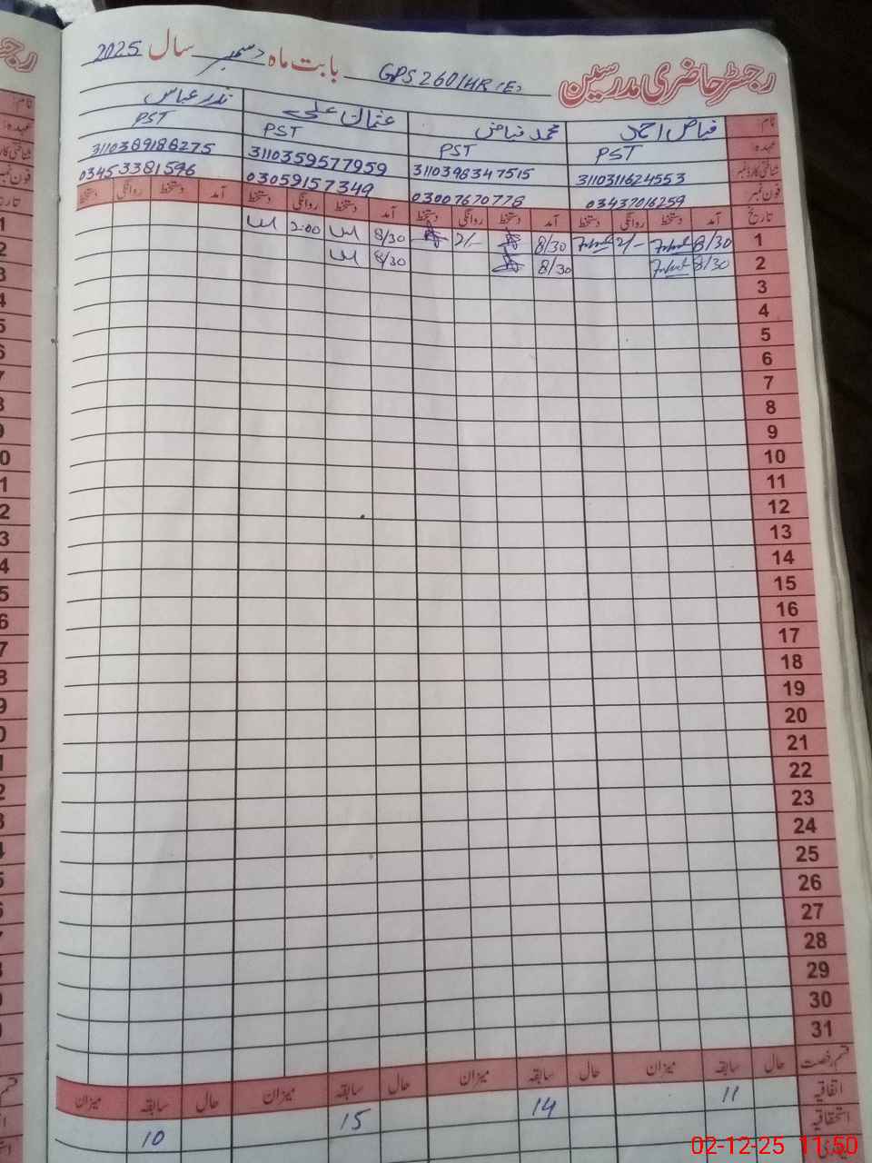 | CNIC | Full Name | Designation | R/C | Absence During Last Calender Month |