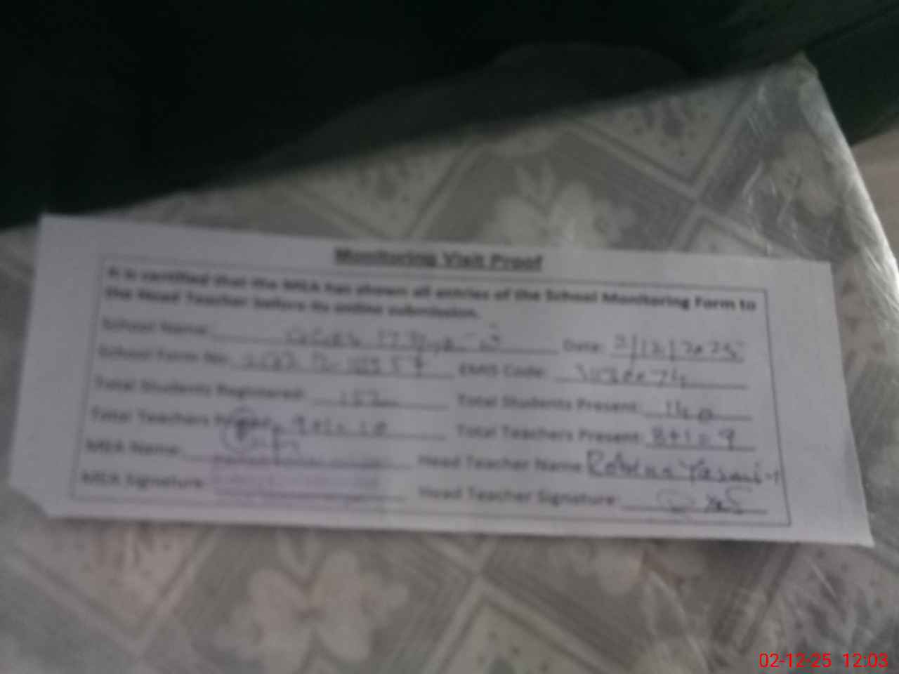 | Attendance Register | Head Teacher | MEA with School | Visit Proof |