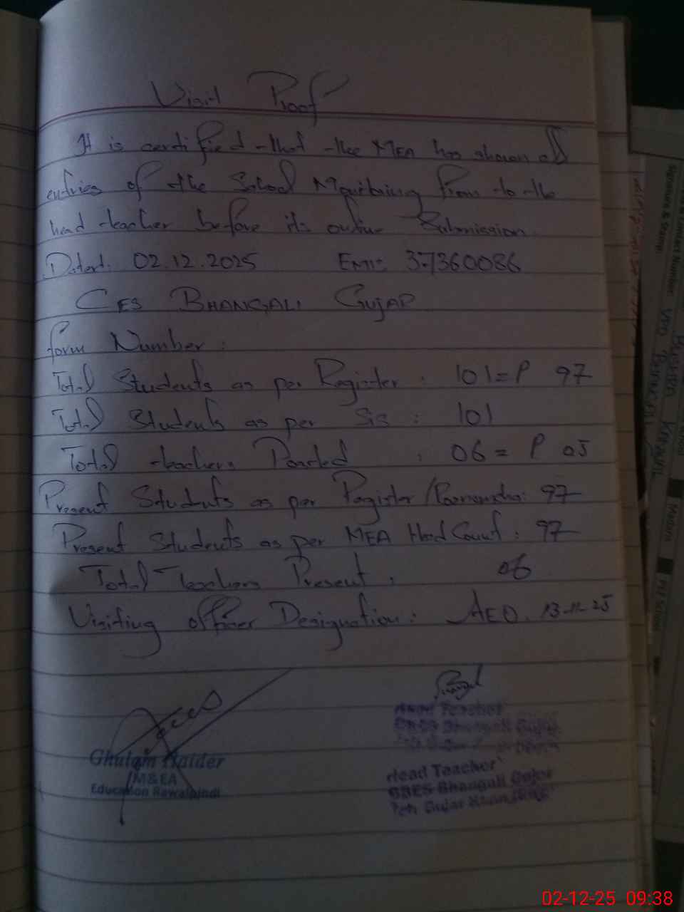 | Attendance Register | Head Teacher | MEA with School | Visit Proof |