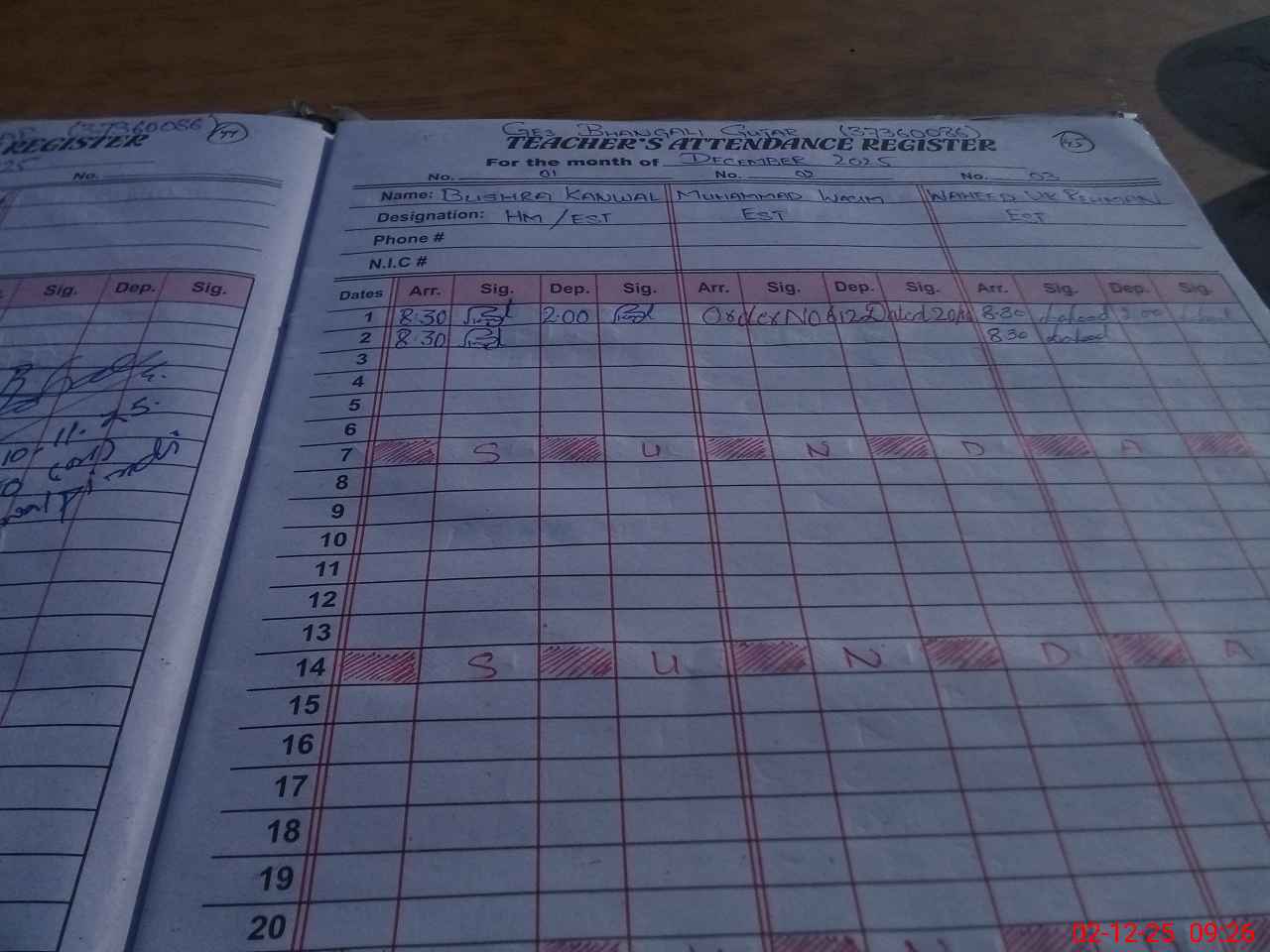 | CNIC | Full Name | Designation | R/C | Absence During Last Calender Month |