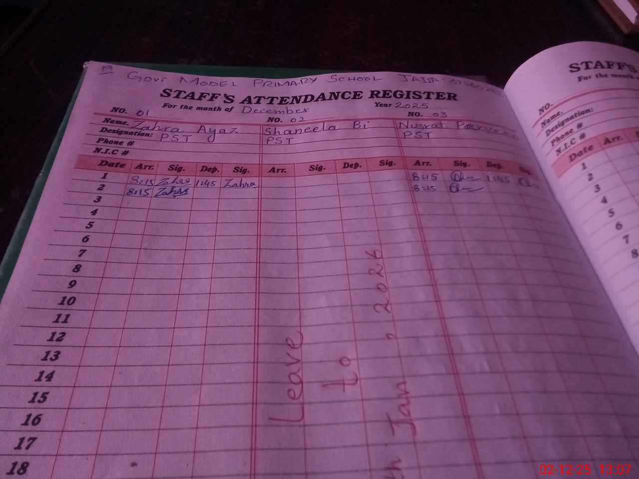 | CNIC | Full Name | Designation | R/C | Absence During Last Calender Month |