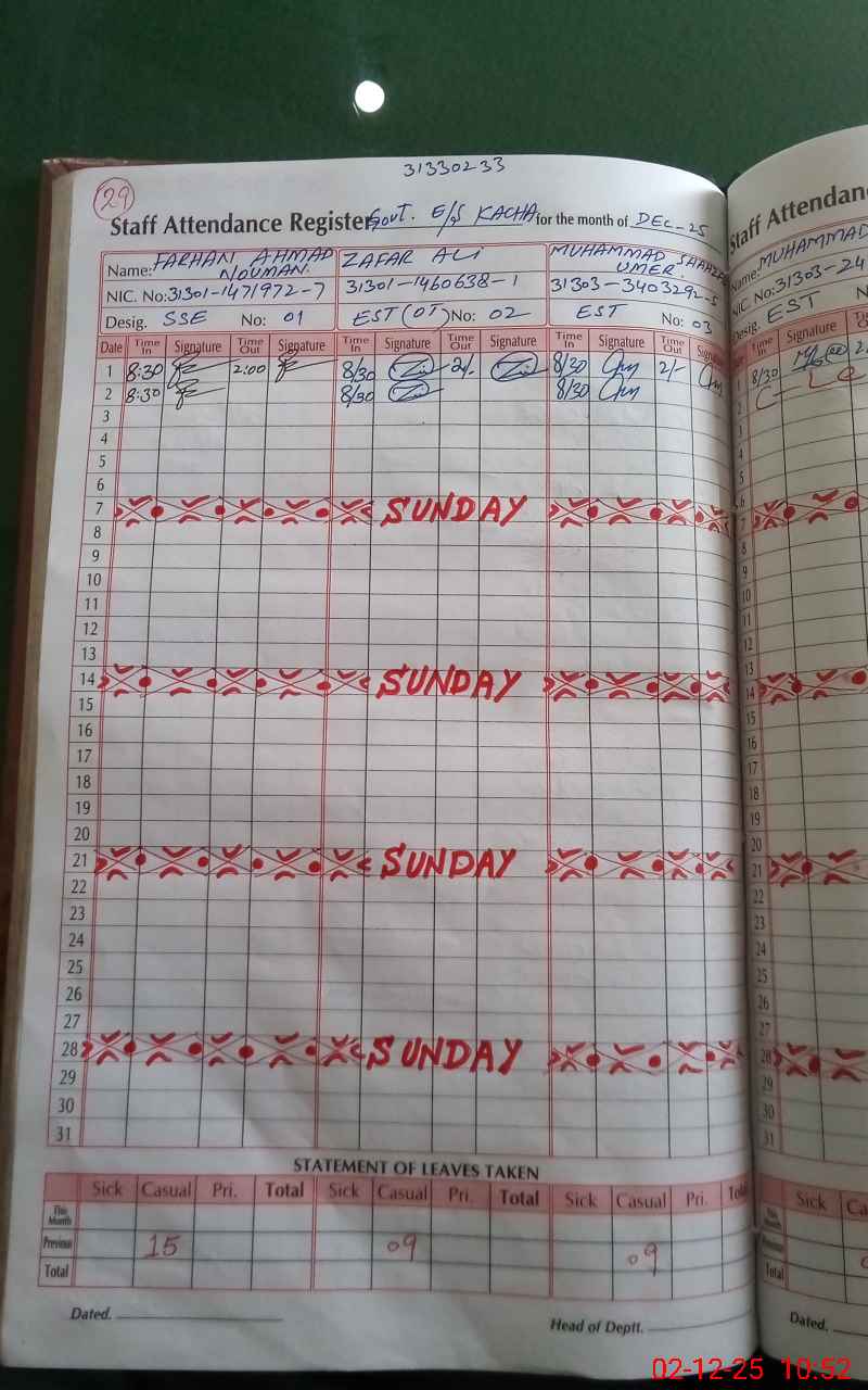 | CNIC | Full Name | Designation | R/C | Absence During Last Calender Month |