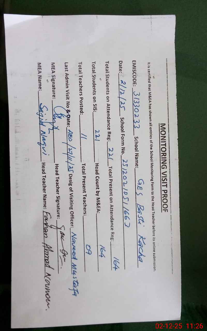 | EMIS Code: 31330233 | Name of School: GES BASTI KACHA | |||