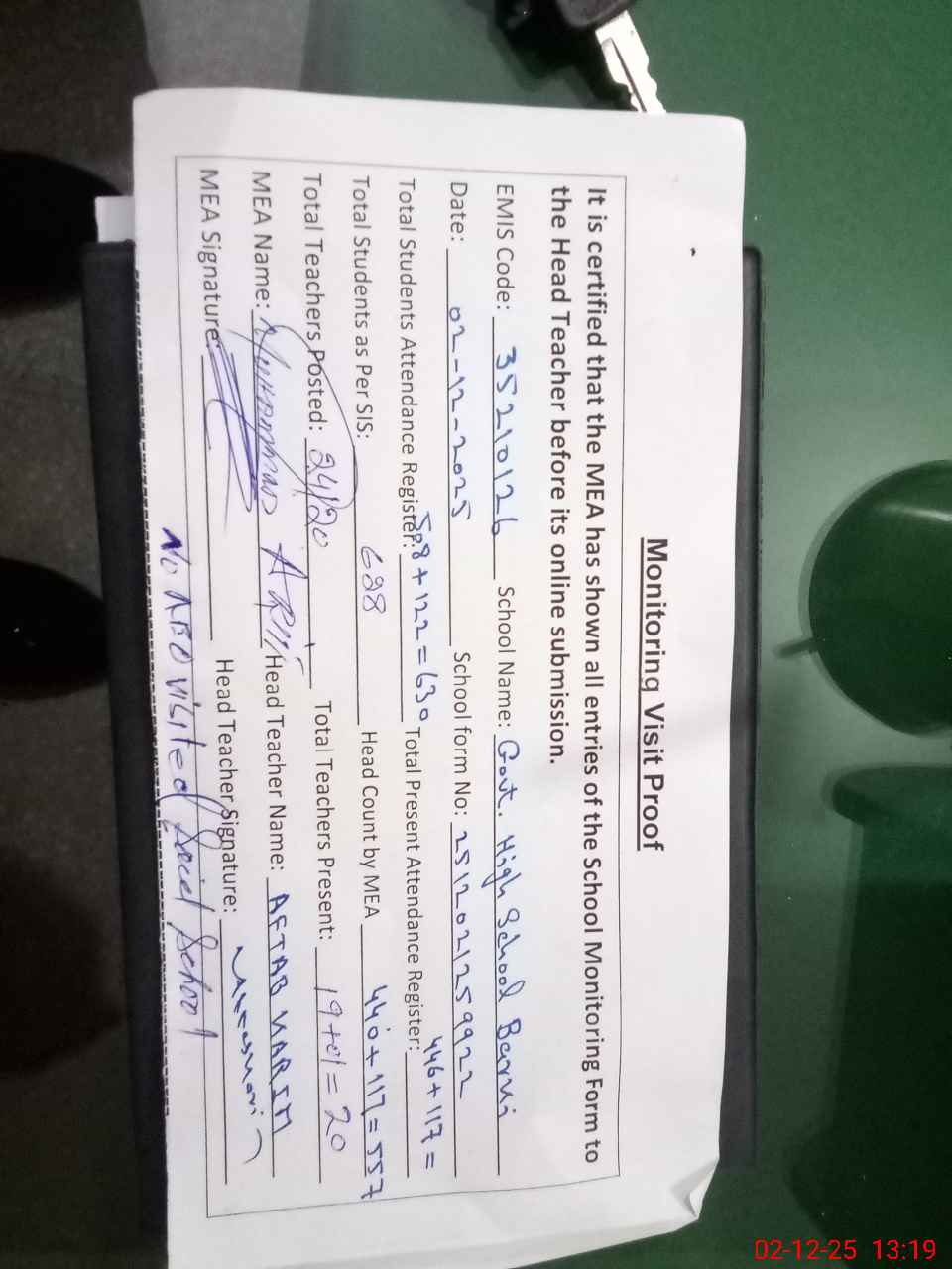 | Attendance Register | Head Teacher | MEA with School | Visit Proof |