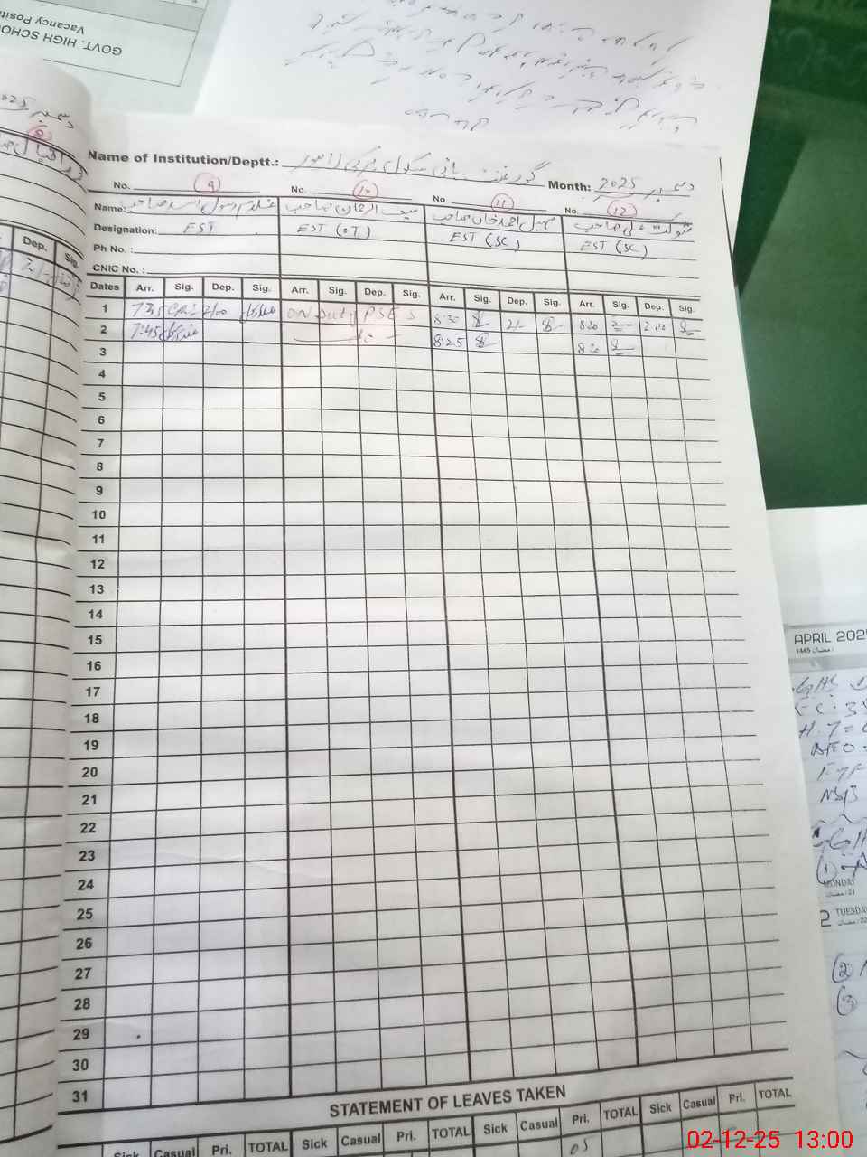 | CNIC | Full Name | Designation | R/C | Absence During Last Calender Month |