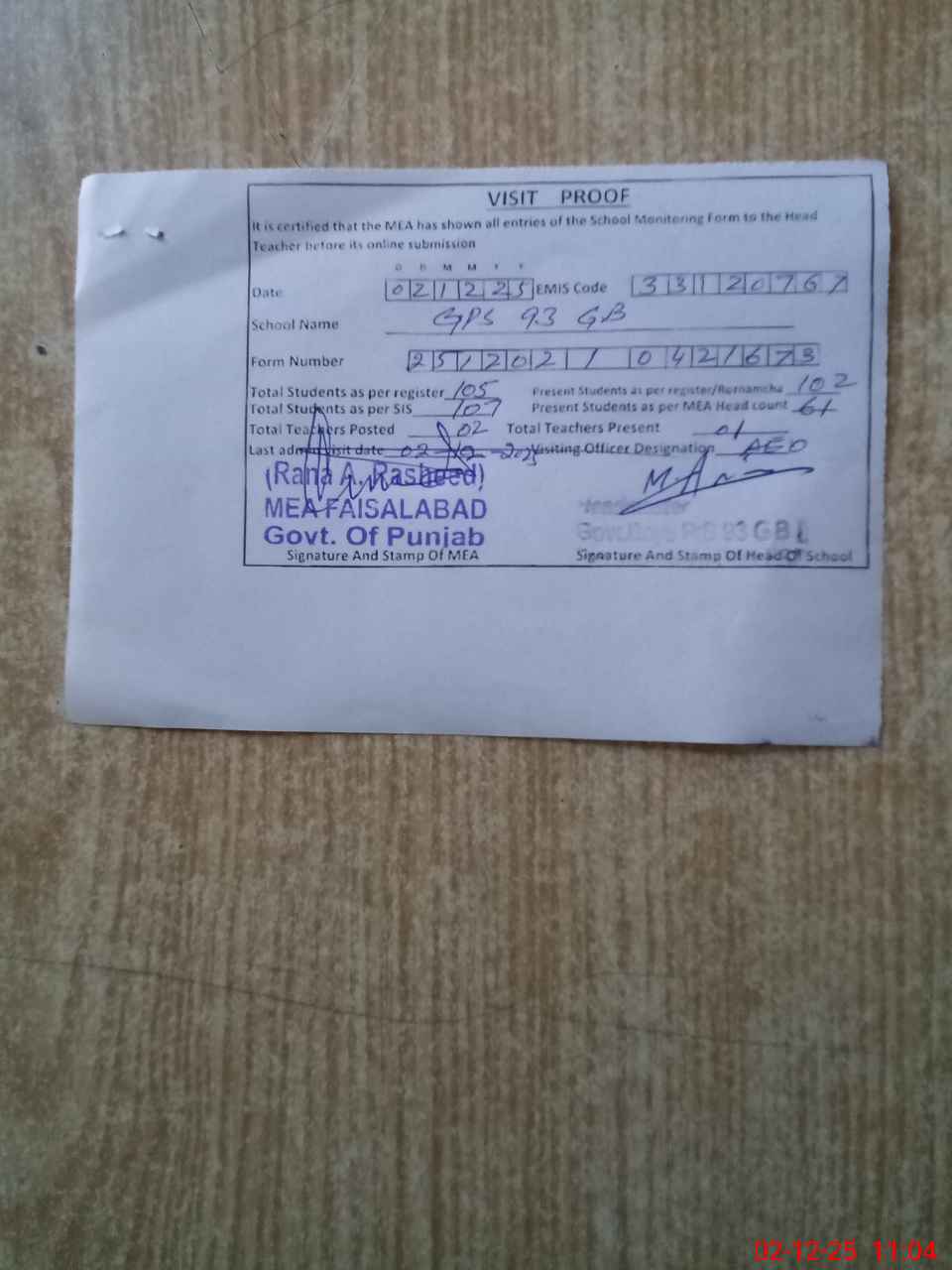 | EMIS Code: 33120767 | Name of School: GPS CHAK NO. 93 GB-II | |||