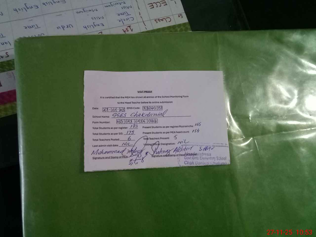 | Attendance Register | Head Teacher | MEA with School | Visit Proof |