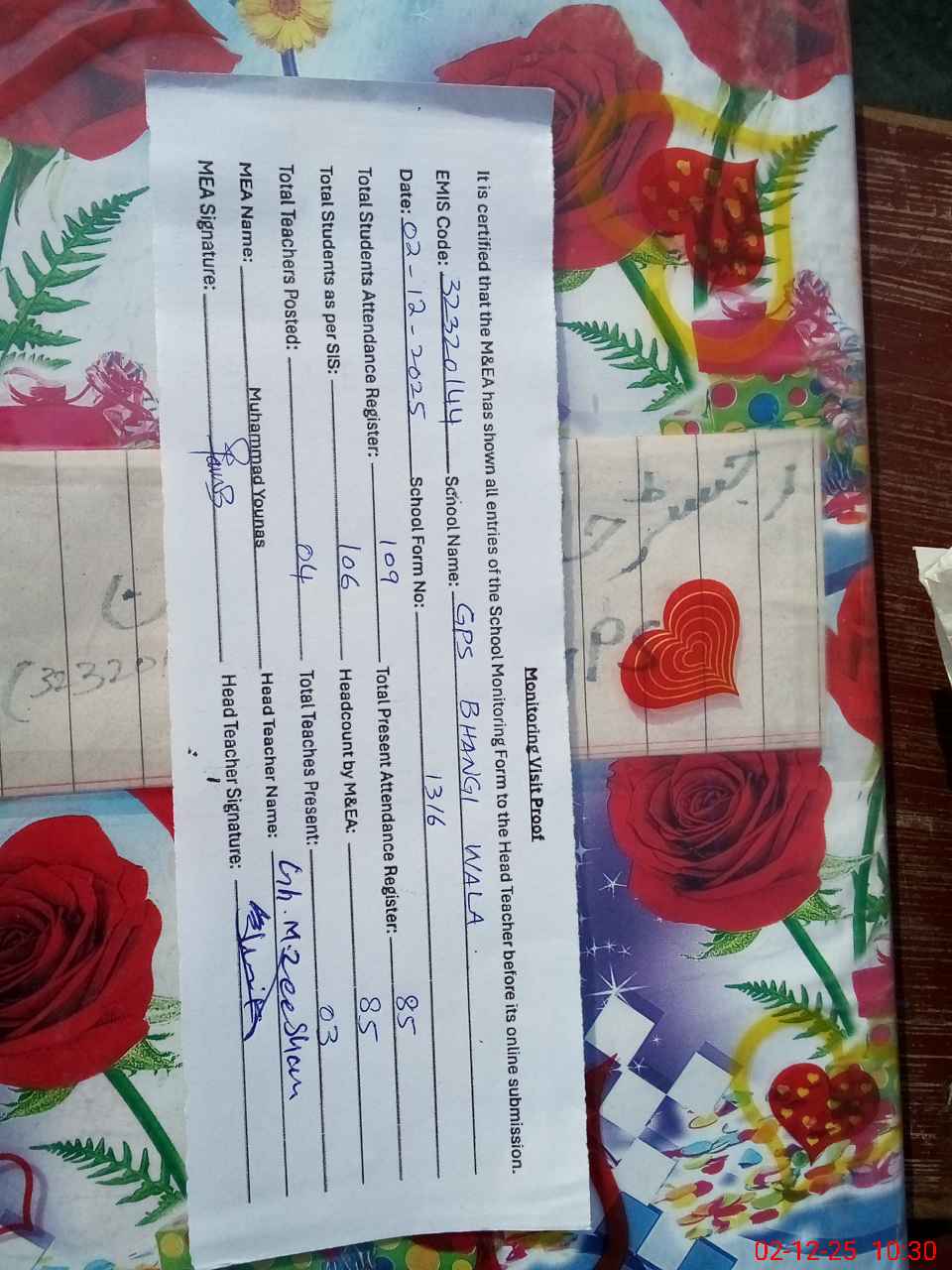 | Attendance Register | Head Teacher | MEA with School | Visit Proof |