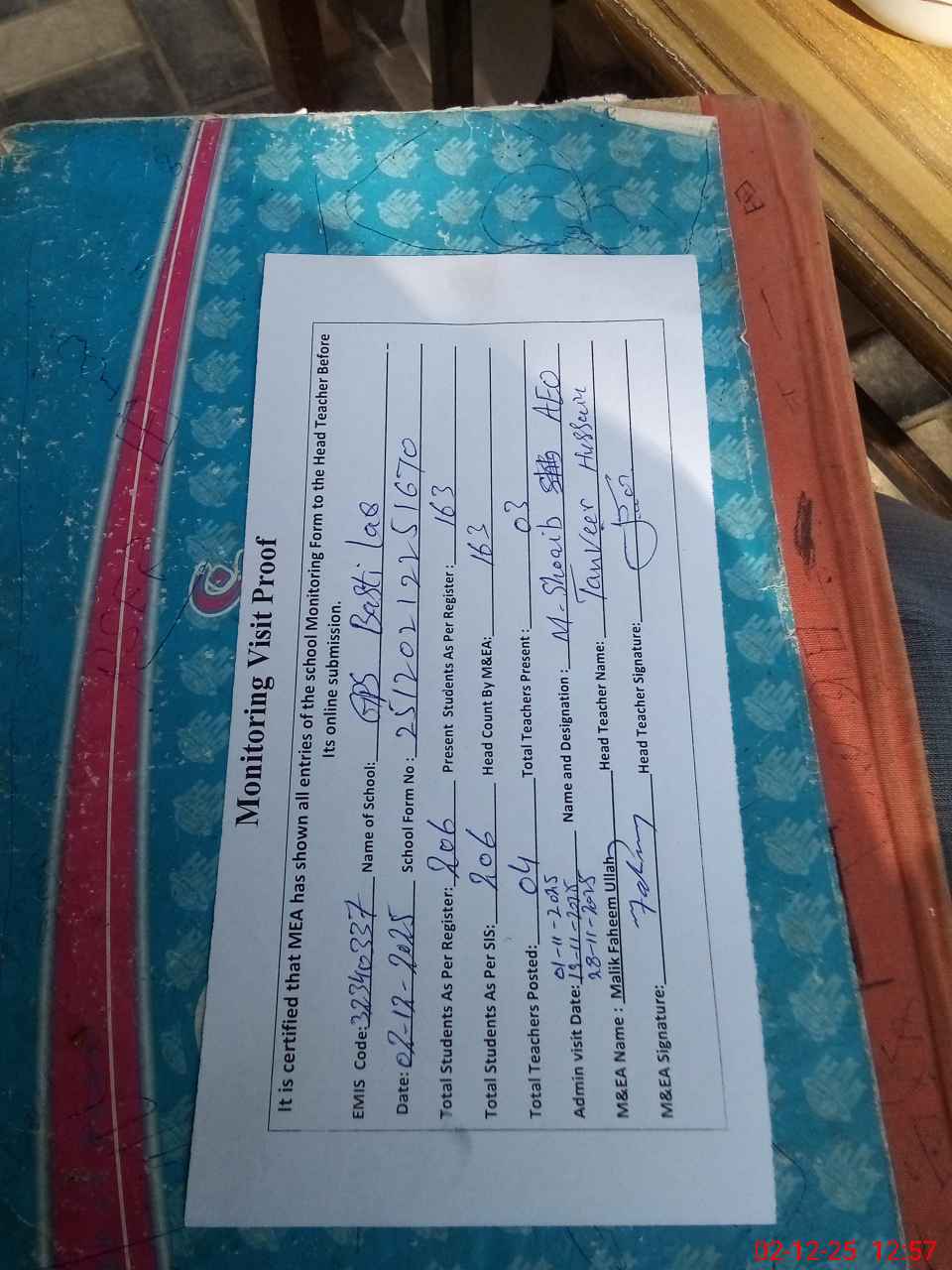 | Attendance Register | Head Teacher | MEA with School | Visit Proof |
