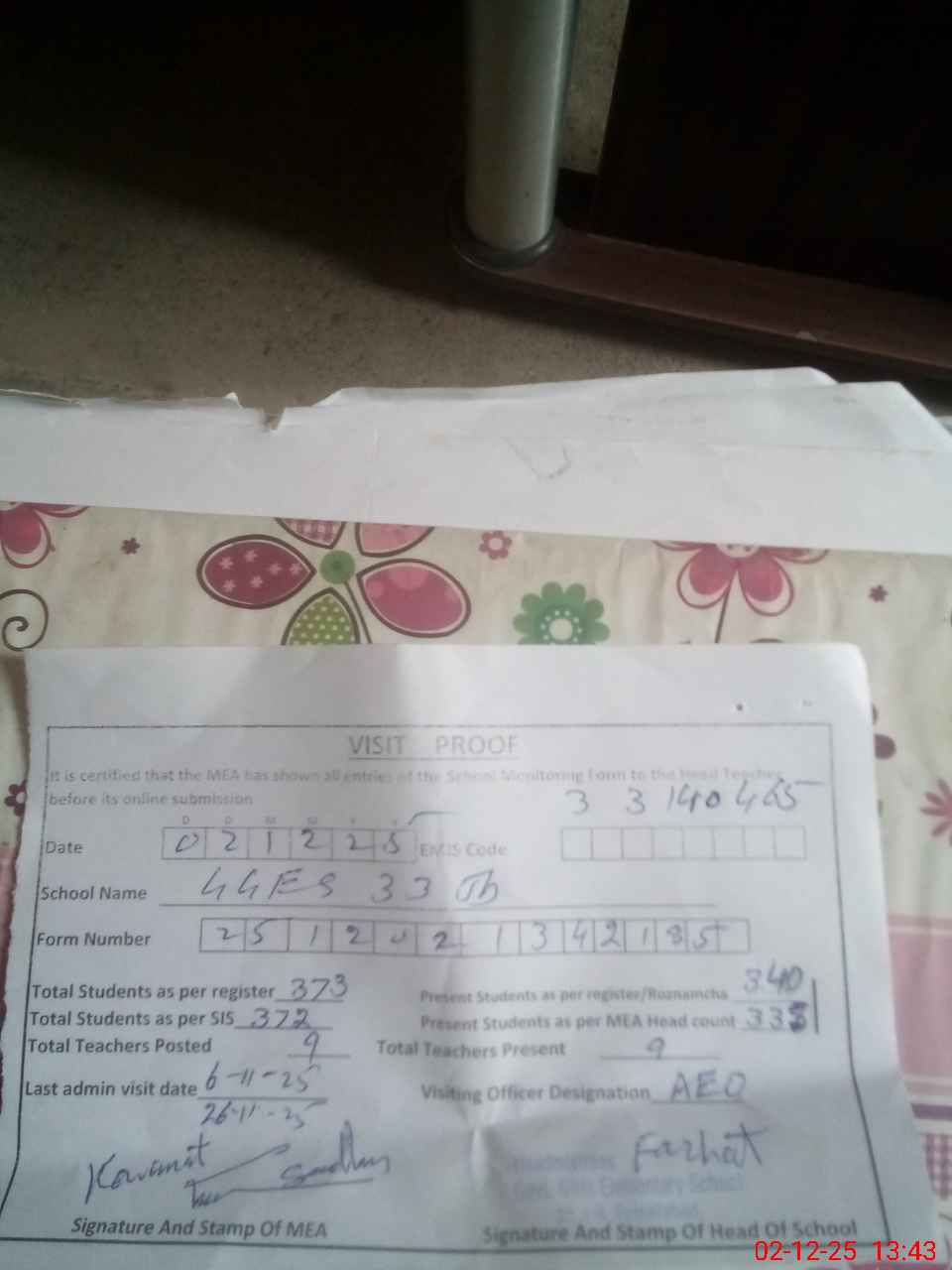 | Certified that this School was Inspected by the Undersigned MEA/DMO Today and the Information Stated Above is as Per Record. | |||||