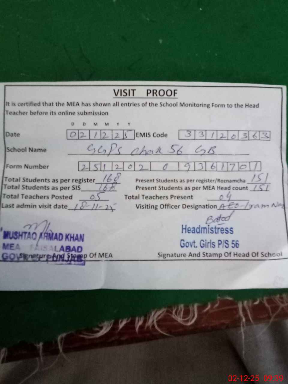 | EMIS Code: 33120363 | Name of School: GGPS CHAK 56 GB JARANWALA | |||