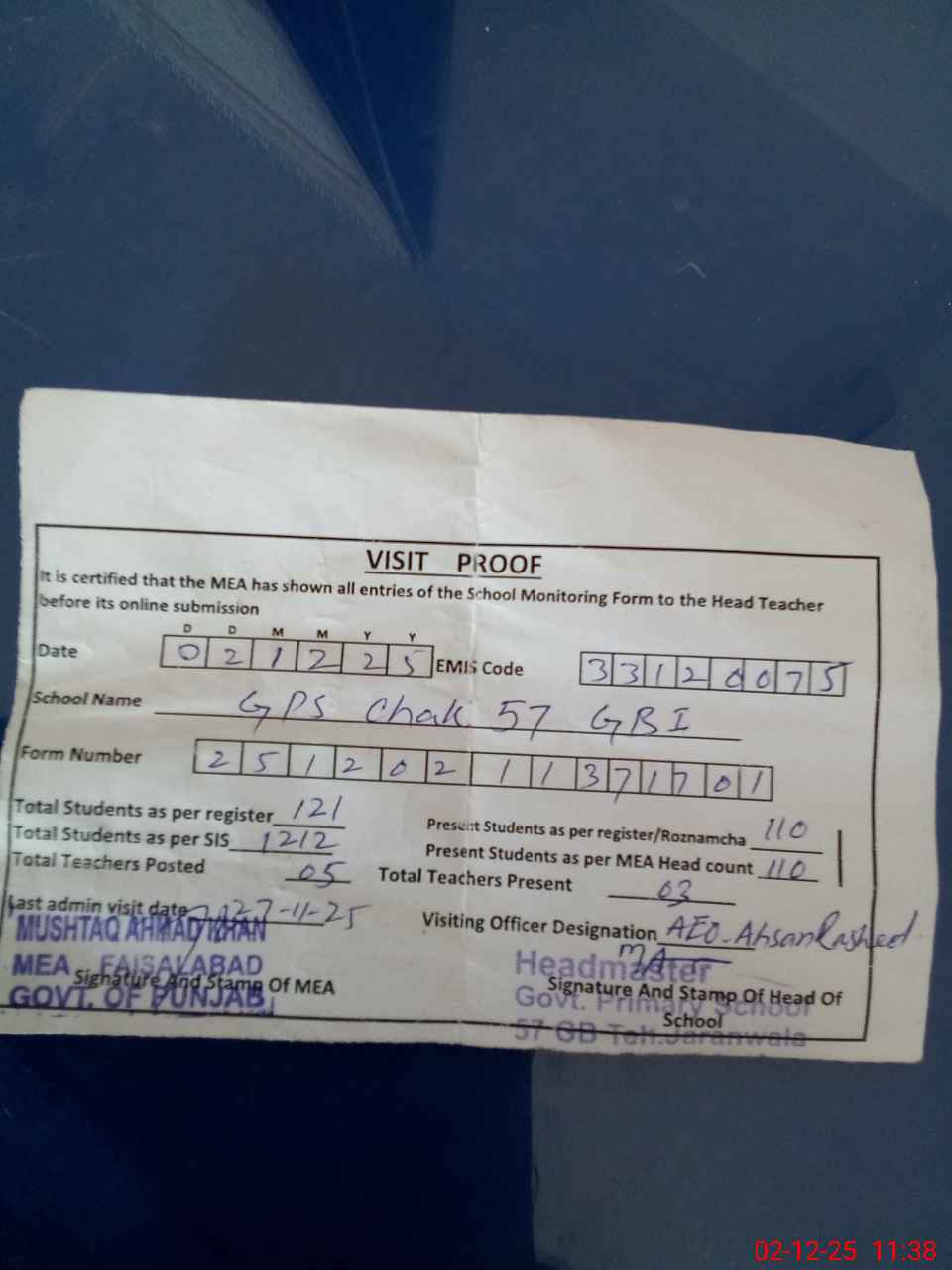 | EMIS Code: 33120075 | Name of School: GPS CHAK 57 GB I | |||