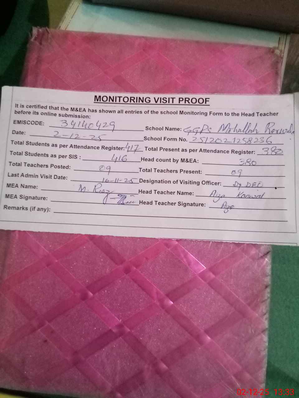 | Attendance Register | Head Teacher | MEA with School | Visit Proof |