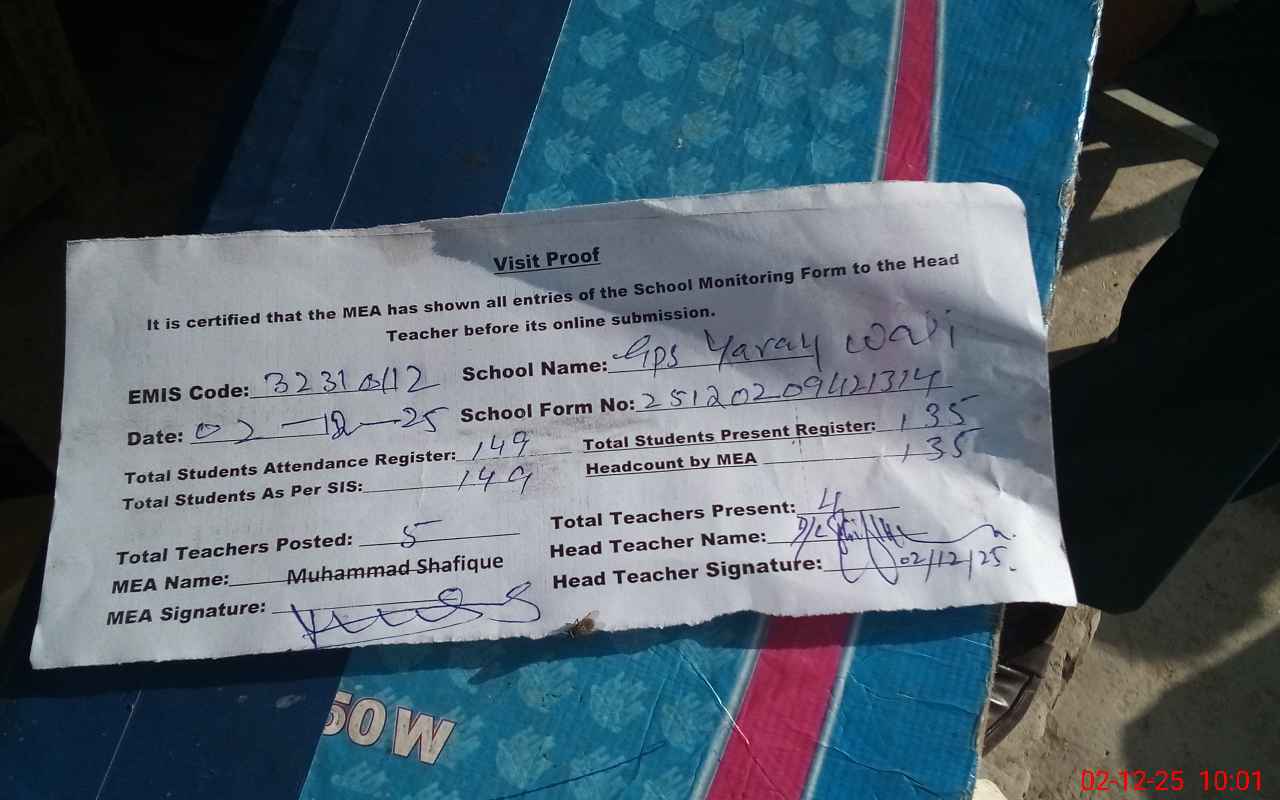 | Attendance Register | Head Teacher | MEA with School | Visit Proof |