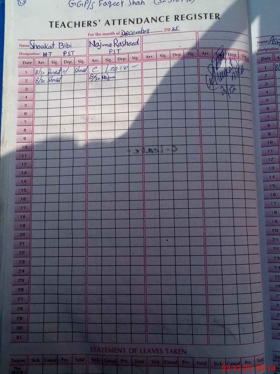 | 32**** | Mu**** Hu**** | ESE Arts | Regular | 0 | 0 | 0 | 0 | 0 | 0 | 0 | 0 | 0 | Absent (Un-Authorized) |