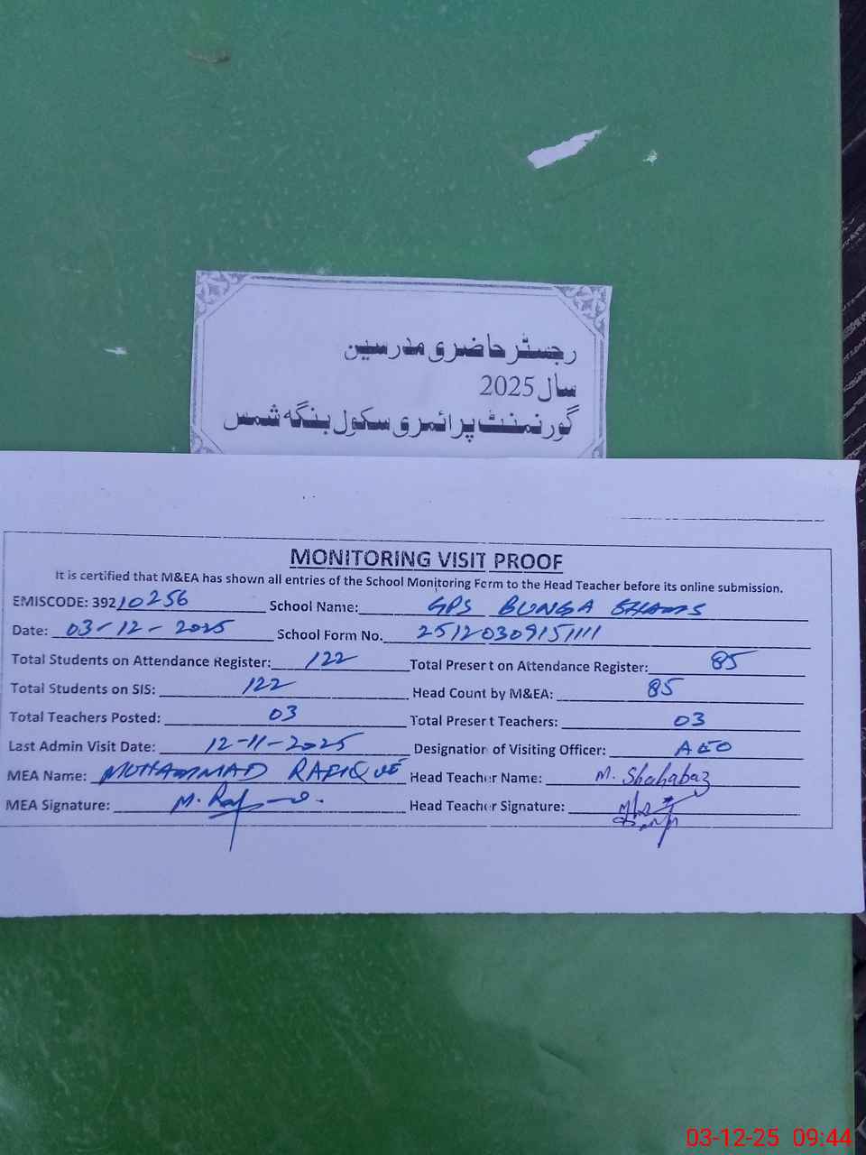 | Attendance Register | Head Teacher | MEA with School | Visit Proof |