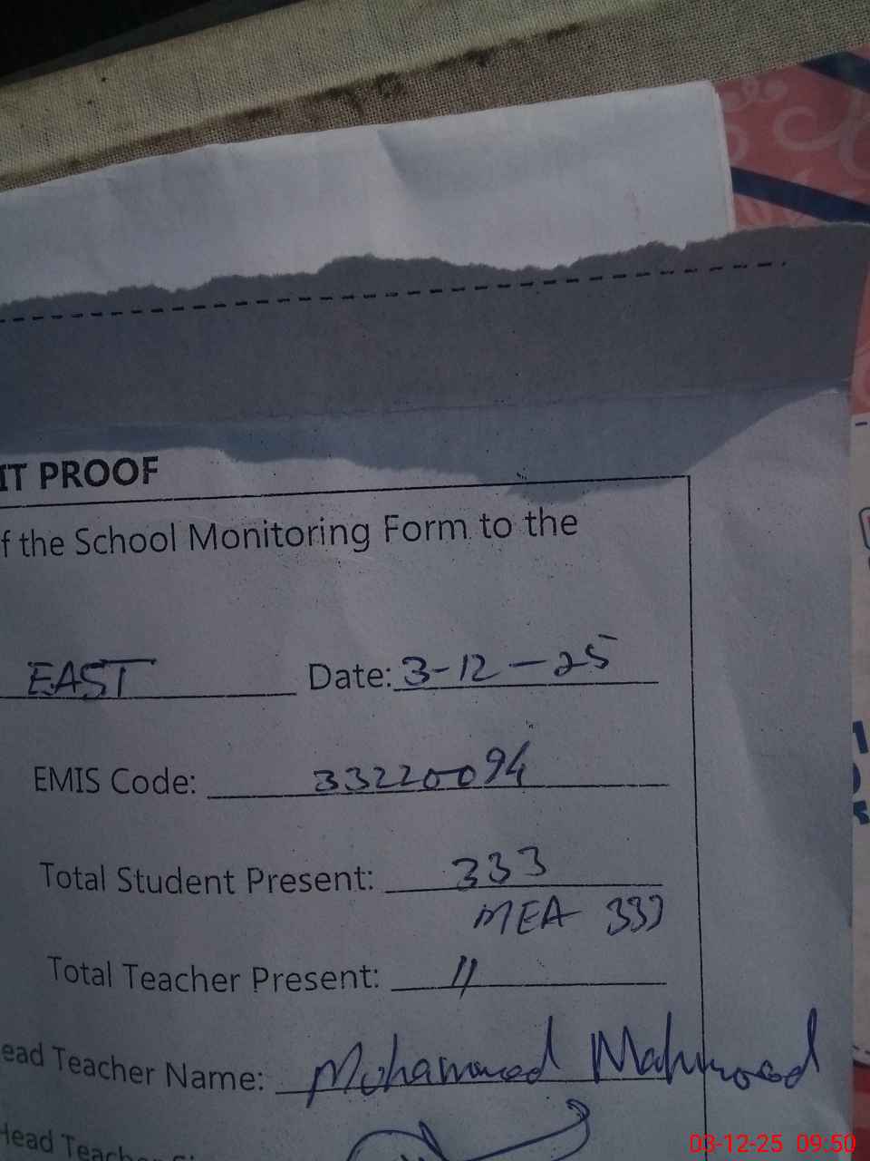 | Attendance Register | Head Teacher | MEA with School | Visit Proof |
