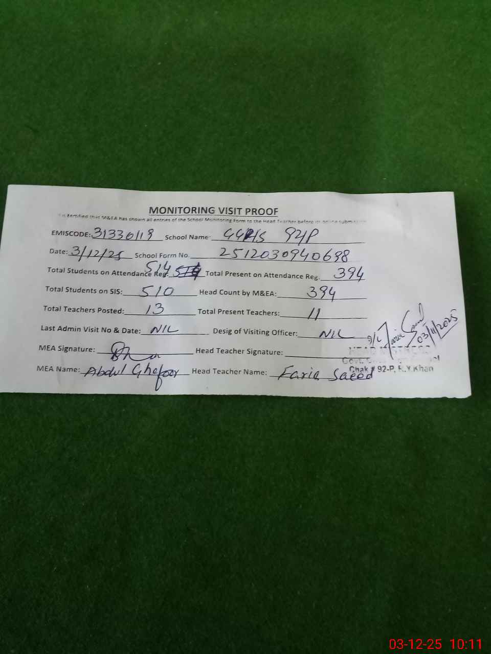 | Attendance Register | Head Teacher | MEA with School | Visit Proof |