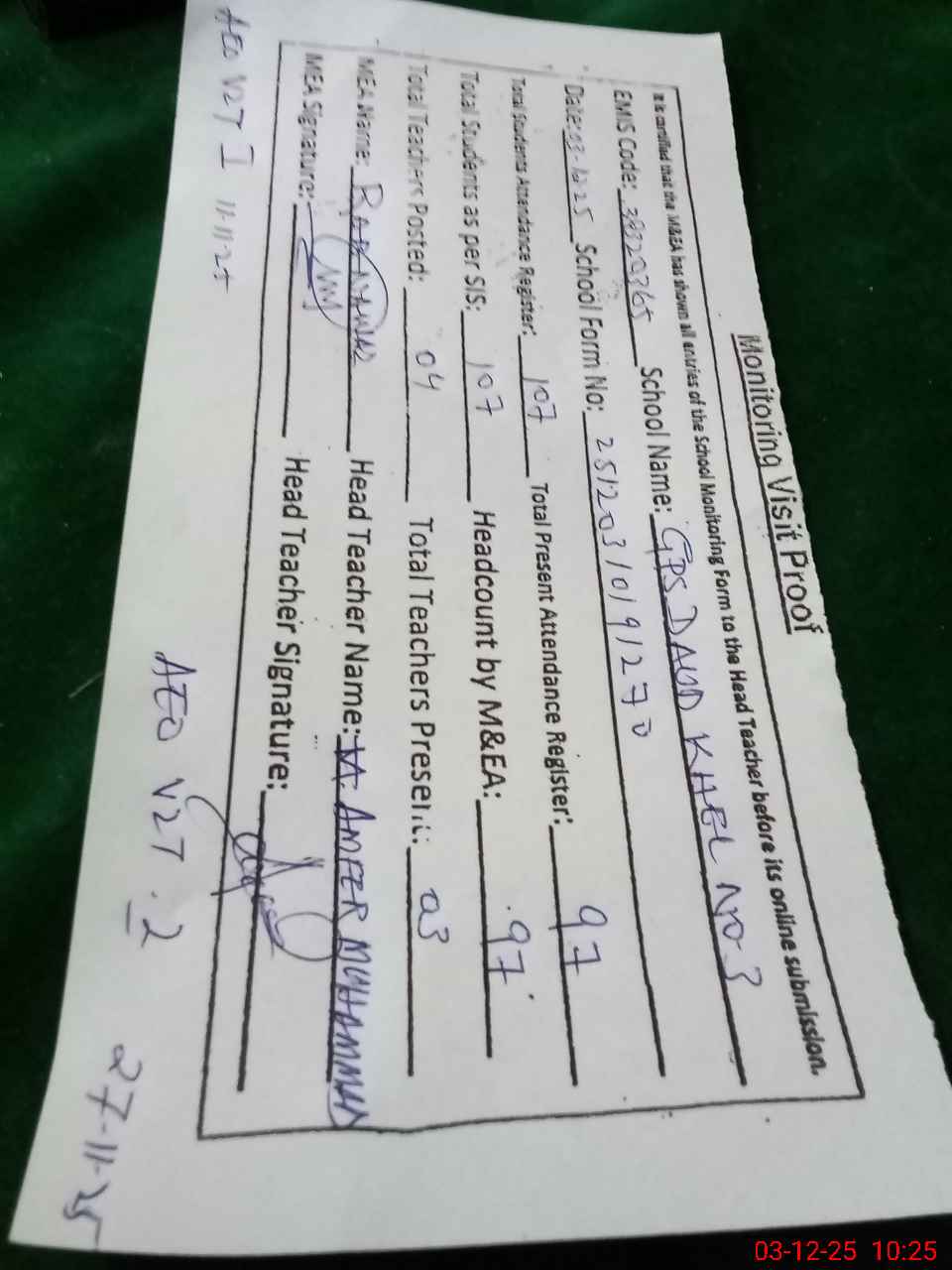 | Attendance Register | Head Teacher | MEA with School | Visit Proof |