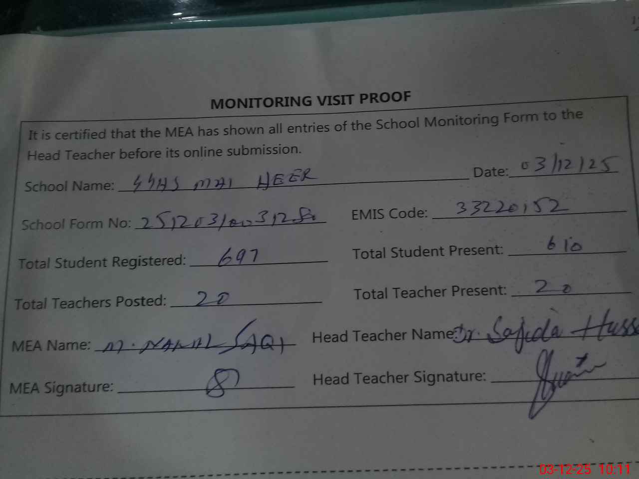 | Attendance Register | Head Teacher | MEA with School | Visit Proof |