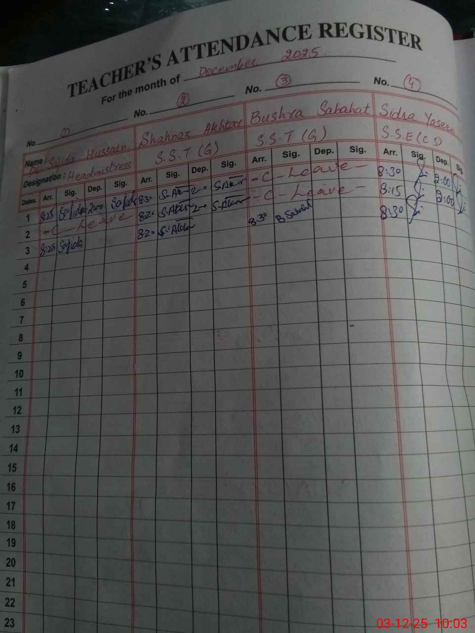 | CNIC | Full Name | Designation | R/C | Absence During Last Calender Month |
