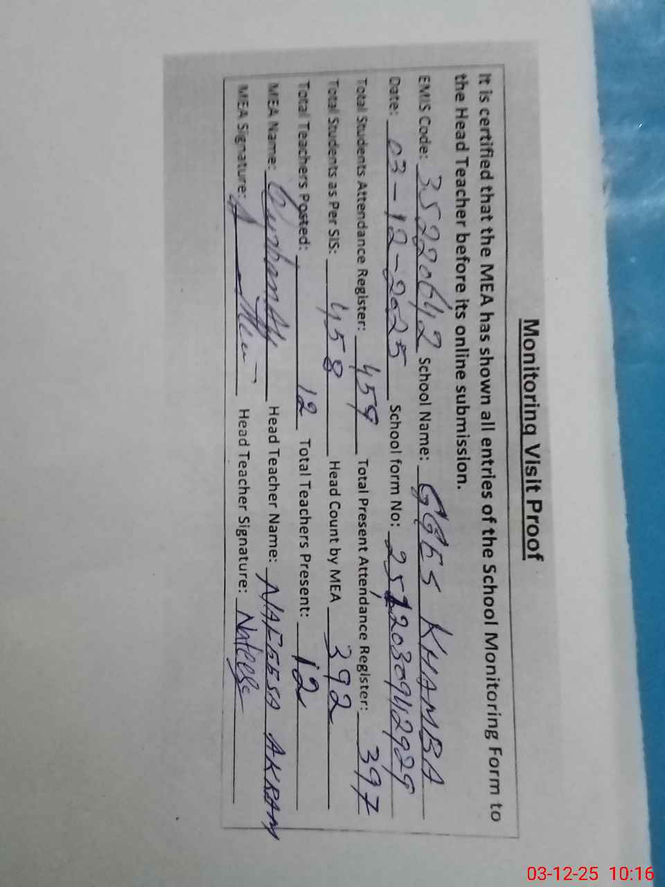 | Attendance Register | Head Teacher | MEA with School | Visit Proof |