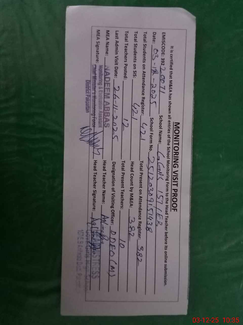 | Attendance Register | Head Teacher | MEA with School | Visit Proof |