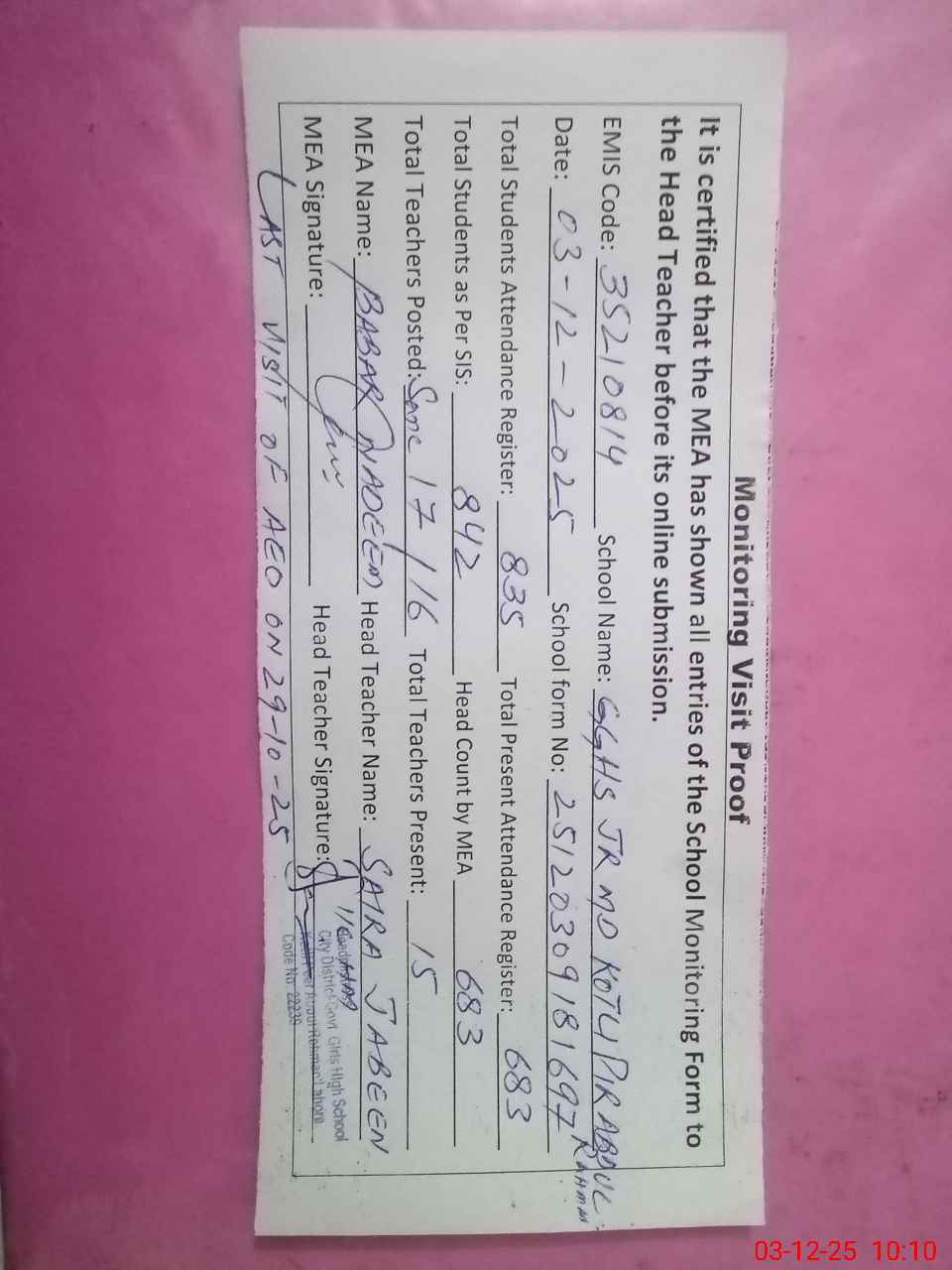 | EMIS Code: 35210814 | Name of School: GGHS JUNIOR MODEL KOTLI PIR ABDUL REHMAN (EX-MCL) | |||