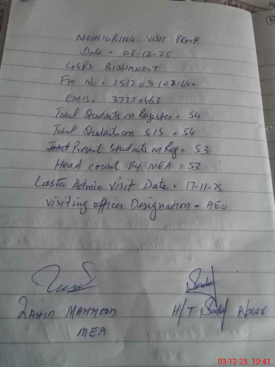 | Attendance Register | Head Teacher | MEA with School | Visit Proof |