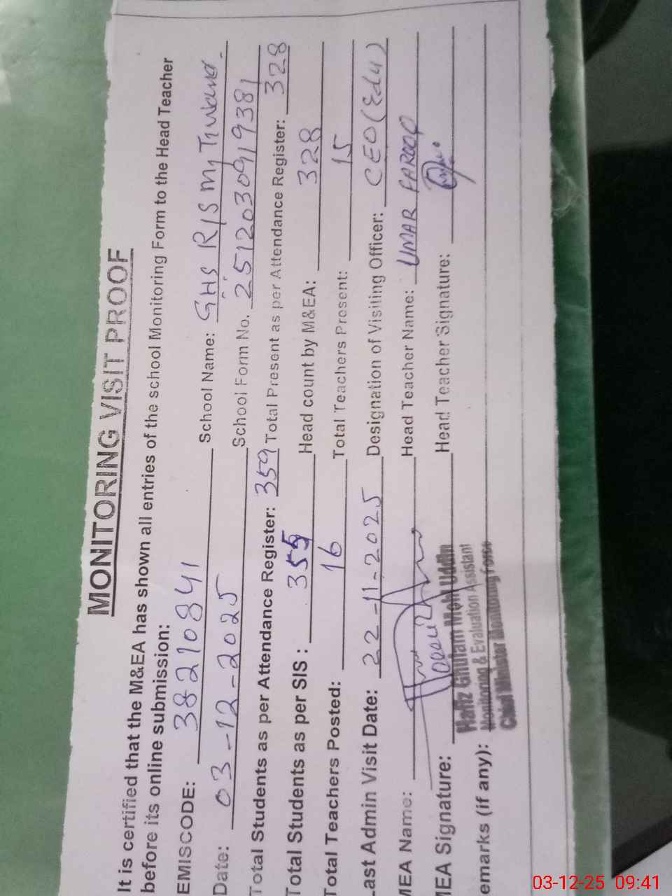 | Attendance Register | Head Teacher | MEA with School | Visit Proof |