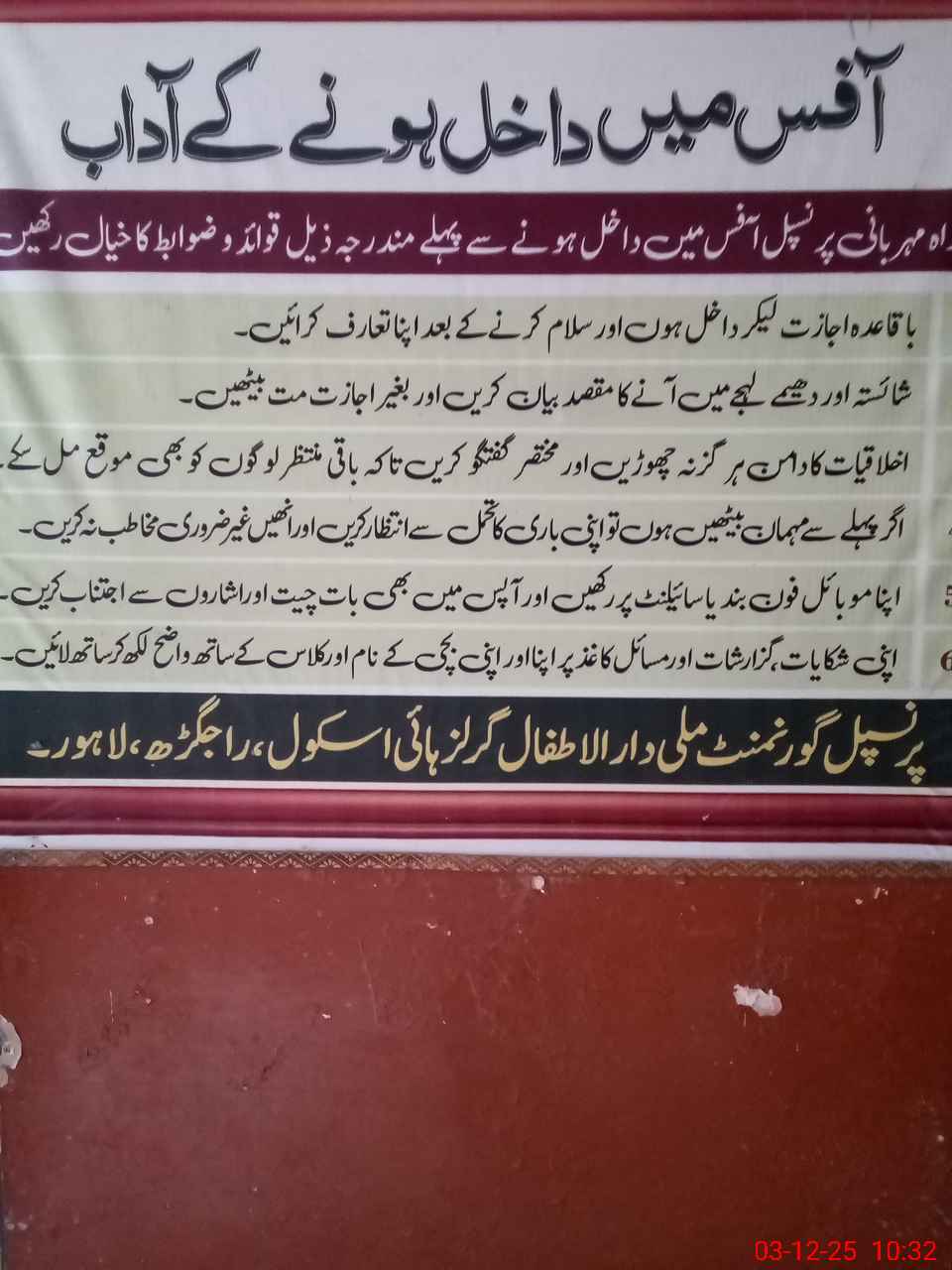 | EMIS Code: 35220088 | Name of School: GGHS MILLI DAR UL ATFAL RAJ GARH ROAD LAHORE | |||