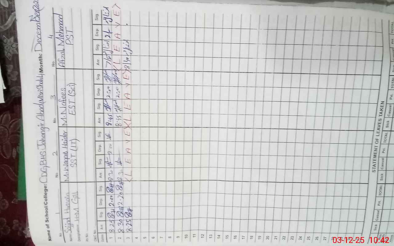 | CNIC | Full Name | Designation | R/C | Absence During Last Calender Month |