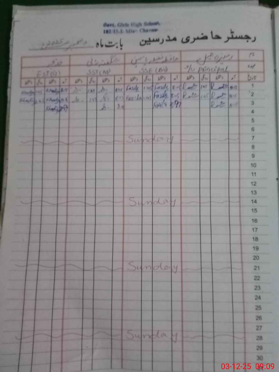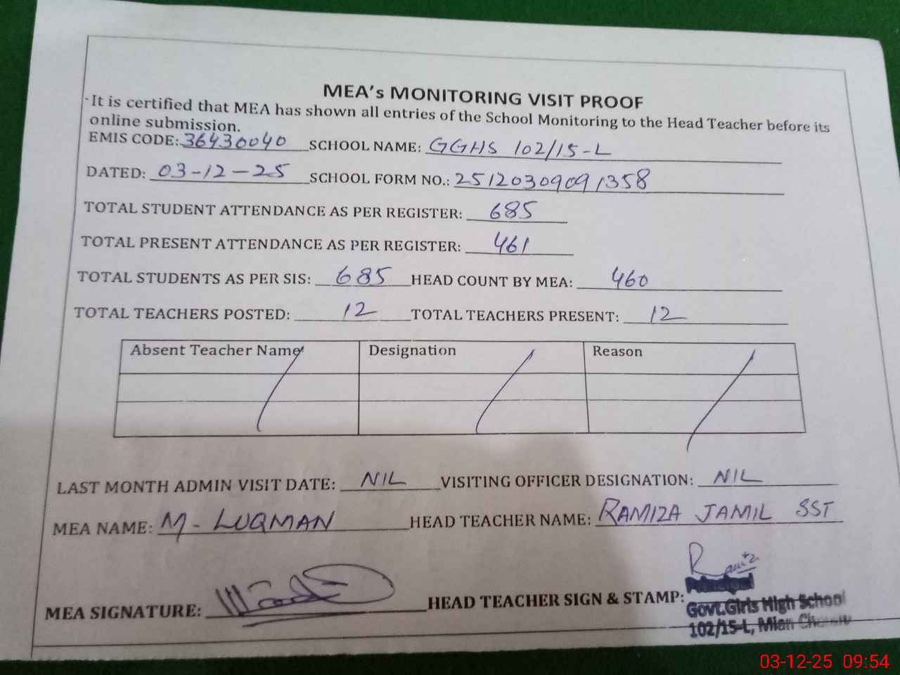 | EMIS Code: 36430040 | Name of School: GGHS 102/15-L, MIAN CHANNU | |||