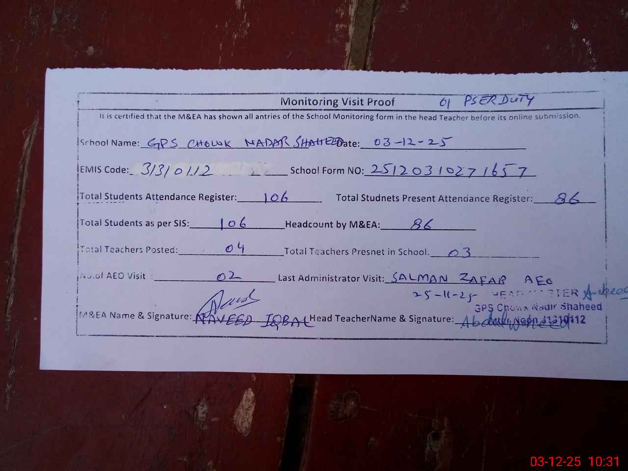 | Attendance Register | Head Teacher | MEA with School | Visit Proof |