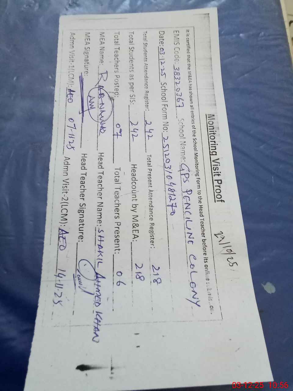 | Attendance Register | Head Teacher | MEA with School | Visit Proof |