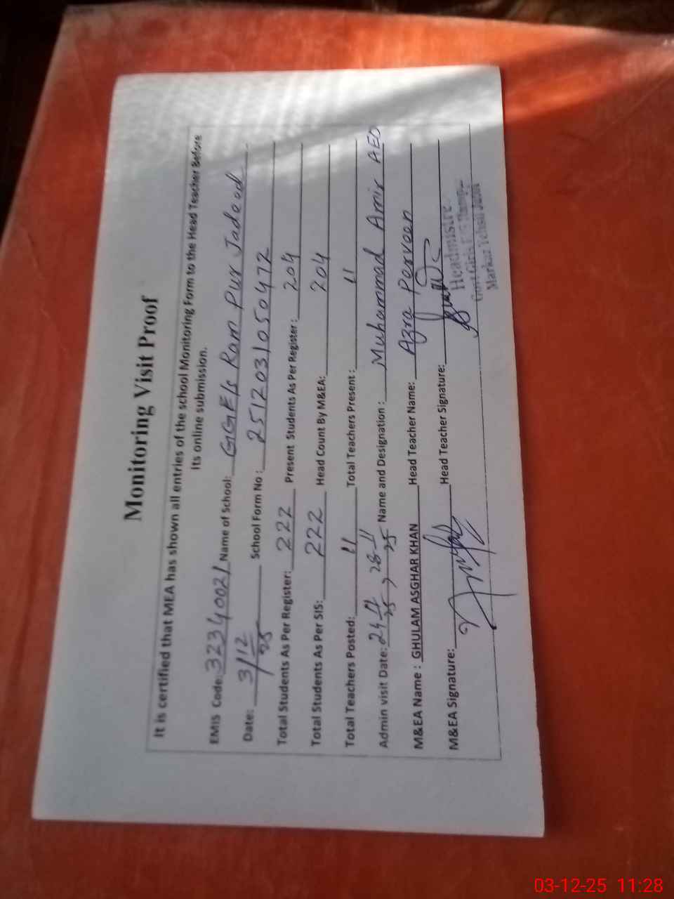 | Attendance Register | Head Teacher | MEA with School | Visit Proof |